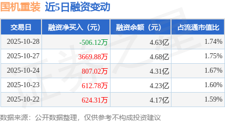 证券之星消息,10月28日,国机重装(601399)融资买入8705.32万元,融资偿还9211.44万元,融资净卖出506.12万元,融资余额4.63亿元,近20个交易日中有12个交易日出现融资净买入。