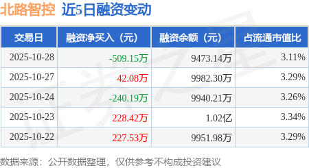 证券之星消息,10月28日,北路智控(301195)融资买入378.04万元,融资偿还887.19万元,融资净卖出509.15万元,融资余额9473.14万元,近20个交易日中有11个交易日出现融资净买入。