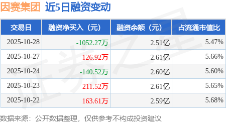 证券之星消息,10月28日,因赛集团(300781)融资买入1021.56万元,融资偿还2073.83万元,融资净卖出1052.27万元,融资余额2.51亿元。