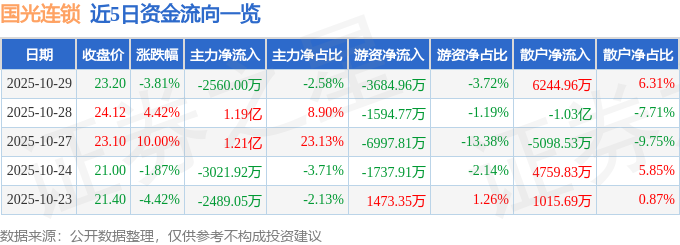 证券之星消息,截至2025年10月29日收盘,国光连锁(605188)报收于23.2元,下跌3.81%,换手率8.4%,成交量42.21万手,成交额9.9亿元。