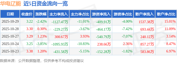 证券之星消息,截至2025年10月29日收盘,华电辽能(600396)报收于3.22元,下跌2.42%,换手率2.18%,成交量32.06万手,成交额1.02亿元。