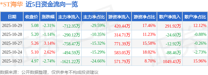 证券之星消息,截至2025年10月29日收盘,*ST海华(600243)报收于5.08元,下跌2.31%,换手率1.08%,成交量4.74万手,成交额2407.82万元。