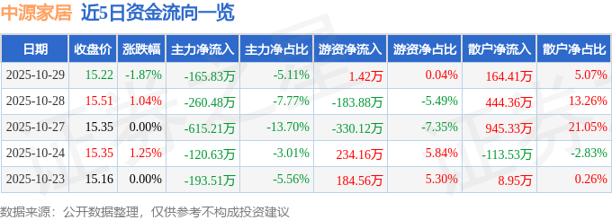 证券之星消息,截至2025年10月29日收盘,中源家居(603709)报收于15.22元,下跌1.87%,换手率1.7%,成交量2.13万手,成交额3245.77万元。