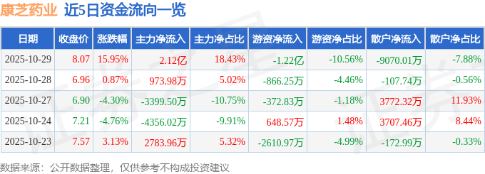 证券之星消息,截至2025年10月29日收盘,康芝药业(300086)报收于8.07元,上涨15.95%,换手率32.87%,成交量144.84万手,成交额11.51亿元。
