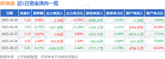 证券之星消息,截至2025年10月29日收盘,跨境通(002640)报收于5.26元,上涨4.99%,换手率17.96%,成交量278.01万手,成交额14.48亿元。