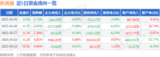 10月29日的资金流向数据方面,主力资金净流出544.59万元,占总成交额6.03%,游资资金净流出323.27万元,占总成交额3.58%,散户资金净流入867.86万元,占总成交额9.61%。