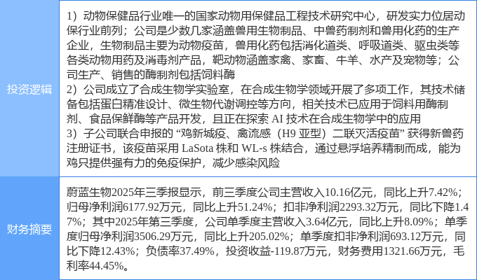 该股为动物保健,合成生物,禽流感概念热股,当日动物保健概念上涨0.92%,合成生物概念上涨0.83%,禽流感概念上涨0.7%。