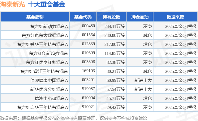 根据2025基金Q3季报公募基金重仓股数据,重仓该股的公募基金共17家,其中持有数量最多的公募基金为东方红资产管理的东方红新动力混合A。东方红新动力混合A目前规模为36.55亿元,最新净值5.794(10月28日),较上一交易日上涨0.17%,近一年上涨28.21%。该公募基金现任基金经理为周云。周云在任的基金产品包括:东方红京东大数据混合A,管理时间为2015年9月14日至今,期间收益率为269.68%;东方红睿轩三年持有混合,管理时间为2022年5月21日至今,期间收益率为50.45%;东方红优享红利混合A,管理时间为2022年7月16日至今,期间收益率为47.9%。