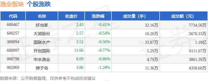证券之星消息,10月29日渔业板块较上一交易日下跌0.71%,獐子岛领跌。当日上证指数报收于4016.33,上涨0.7%。深证成指报收于13691.38,上涨1.95%。渔业板块个股涨跌见下表: