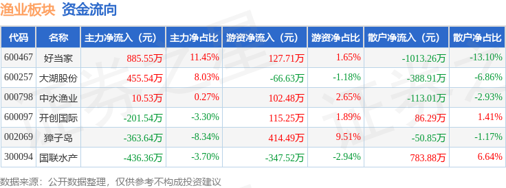 从资金流向上来看,当日渔业板块主力资金净流入350.07万元,游资资金净流入345.78万元,散户资金净流出695.85万元。渔业板块个股资金流向见下表: