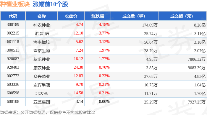 证券之星消息,10月29日种植业板块较上一交易日上涨0.65%,神农种业领涨。当日上证指数报收于4016.33,上涨0.7%。深证成指报收于13691.38,上涨1.95%。种植业板块个股涨跌见下表: