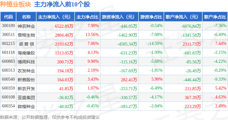 从资金流向上来看,当日种植业板块主力资金净流入2836.1万元,游资资金净流出7225.43万元,散户资金净流入4389.33万元。种植业板块个股资金流向见下表: