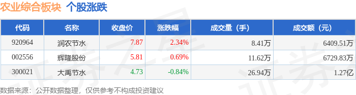 证券之星消息,10月29日农业综合板块较上一交易日上涨0.03%,润农节水领涨。当日上证指数报收于4016.33,上涨0.7%。深证成指报收于13691.38,上涨1.95%。农业综合板块个股涨跌见下表: