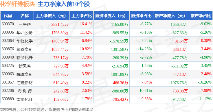 从资金流向上来看,当日化学纤维板块主力资金净流出1503.45万元,游资资金净流出5417.43万元,散户资金净流入6920.88万元。化学纤维板块个股资金流向见下表: