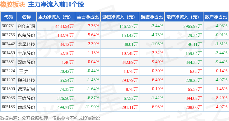 从资金流向上来看,当日橡胶板块主力资金净流出1.13亿元,游资资金净流入2495.44万元,散户资金净流入8794.91万元。橡胶板块个股资金流向见下表: