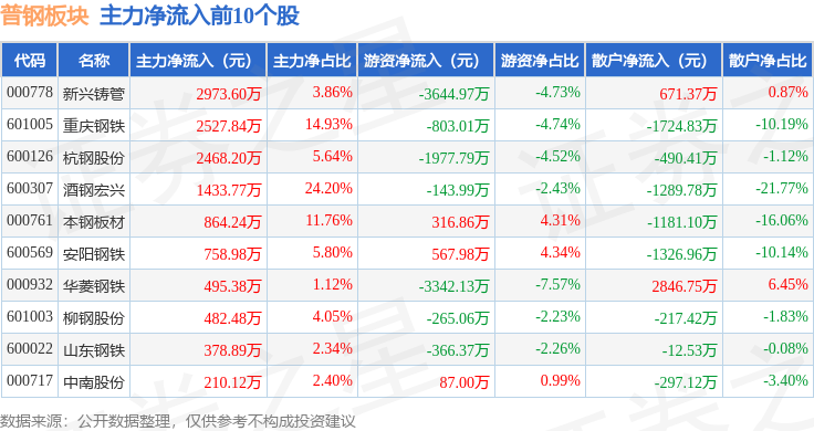 从资金流向上来看,当日普钢板块主力资金净流出759.92万元,游资资金净流出9863.12万元,散户资金净流入1.06亿元。普钢板块个股资金流向见下表: