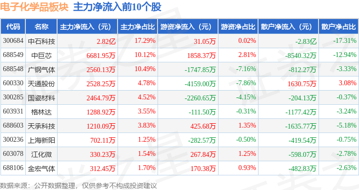 从资金流向上来看,当日电子化学品板块主力资金净流出6.04亿元,游资资金净流入2.08亿元,散户资金净流入3.96亿元。电子化学品板块个股资金流向见下表: