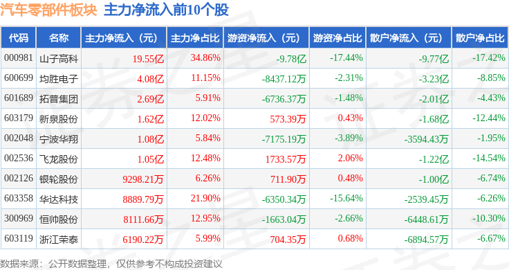 从资金流向上来看,当日汽车零部件板块主力资金净流入13.31亿元,游资资金净流出9.02亿元,散户资金净流出4.29亿元。汽车零部件板块个股资金流向见下表:
