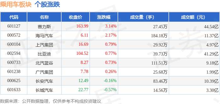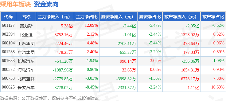 从资金流向上来看,当日乘用车板块主力资金净流入5.2亿元,游资资金净流出4.31亿元,散户资金净流出8893.14万元。乘用车板块个股资金流向见下表: