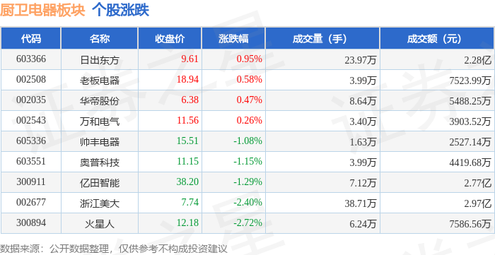 证券之星消息,10月29日厨卫电器板块较上一交易日下跌0.25%,火星人领跌。当日上证指数报收于4016.33,上涨0.7%。深证成指报收于13691.38,上涨1.95%。厨卫电器板块个股涨跌见下表: