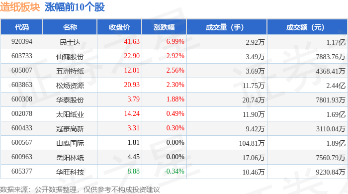 证券之星消息,10月29日造纸板块较上一交易日上涨0.01%,民士达领涨。当日上证指数报收于4016.33,上涨0.7%。深证成指报收于13691.38,上涨1.95%。造纸板块个股涨跌见下表: