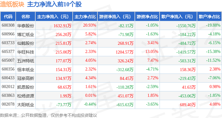 从资金流向上来看,当日造纸板块主力资金净流出1.98亿元,游资资金净流入1624.76万元,散户资金净流入1.82亿元。造纸板块个股资金流向见下表: