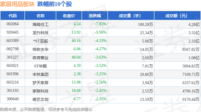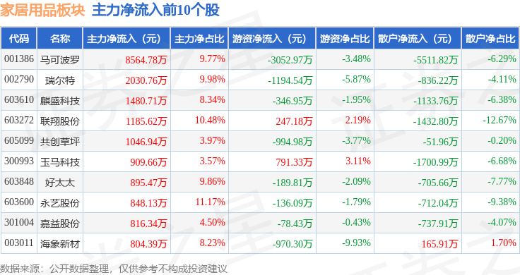 从资金流向上来看,当日家居用品板块主力资金净流出9526.62万元,游资资金净流入968.18万元,散户资金净流入8558.44万元。家居用品板块个股资金流向见下表: