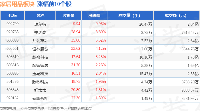 证券之星消息,10月29日家居用品板块较上一交易日上涨0.01%,瑞尔特领涨。当日上证指数报收于4016.33,上涨0.7%。深证成指报收于13691.38,上涨1.95%。家居用品板块个股涨跌见下表:
