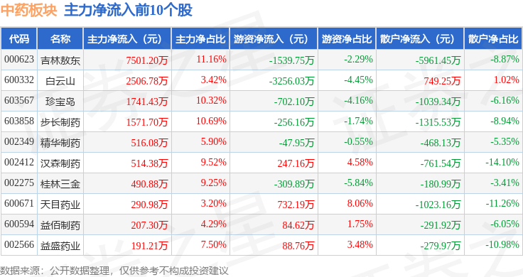 从资金流向上来看,当日中药板块主力资金净流出5.22亿元,游资资金净流出3782.33万元,散户资金净流入5.6亿元。中药板块个股资金流向见下表: