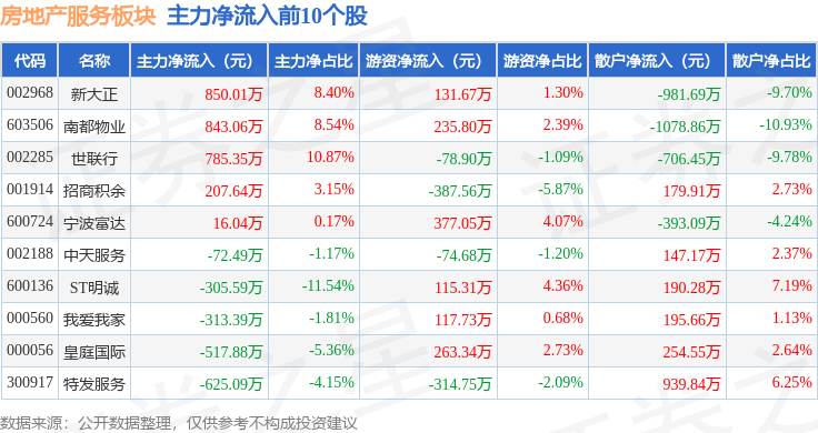 从资金流向上来看,当日房地产服务板块主力资金净流出135.18万元,游资资金净流入1106.91万元,散户资金净流出971.73万元。房地产服务板块个股资金流向见下表:
