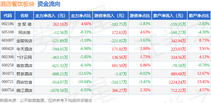 从资金流向上来看,当日酒店餐饮板块主力资金净流出4229.4万元,游资资金净流入902.53万元,散户资金净流入3326.87万元。酒店餐饮板块个股资金流向见下表: