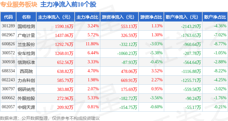 从资金流向上来看,当日专业服务板块主力资金净流出1.67亿元,游资资金净流入6549.08万元,散户资金净流入1.02亿元。专业服务板块个股资金流向见下表: