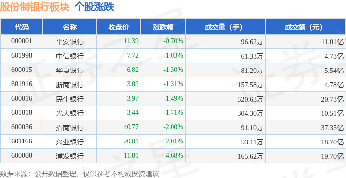 证券之星消息,10月29日股份制银行板块较上一交易日下跌2.1%,浦发银行领跌。当日上证指数报收于4016.33,上涨0.7%。深证成指报收于13691.38,上涨1.95%。股份制银行板块个股涨跌见下表: