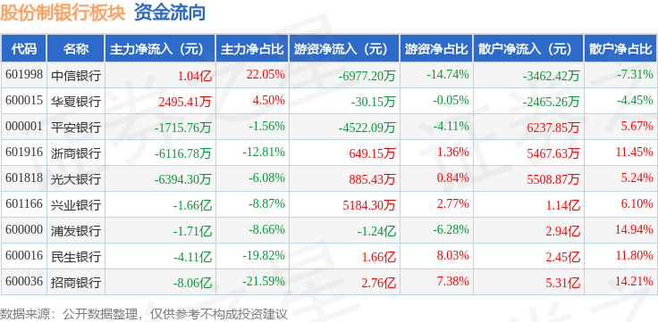 从资金流向上来看,当日股份制银行板块主力资金净流出15.67亿元,游资资金净流入2.7亿元,散户资金净流入12.97亿元。股份制银行板块个股资金流向见下表: