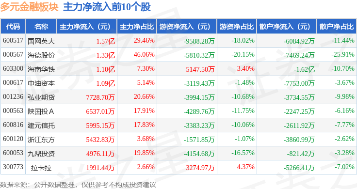 从资金流向上来看,当日多元金融板块主力资金净流入7.54亿元,游资资金净流出2.9亿元,散户资金净流出4.64亿元。多元金融板块个股资金流向见下表:
