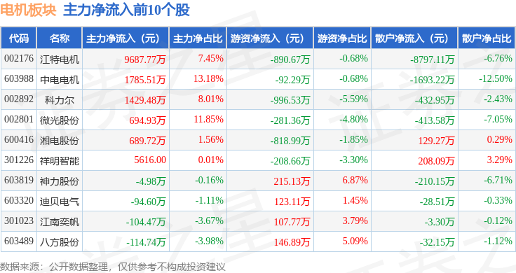 从资金流向上来看,当日电机板块主力资金净流出9.66亿元,游资资金净流入1.06亿元,散户资金净流入8.6亿元。电机板块个股资金流向见下表: