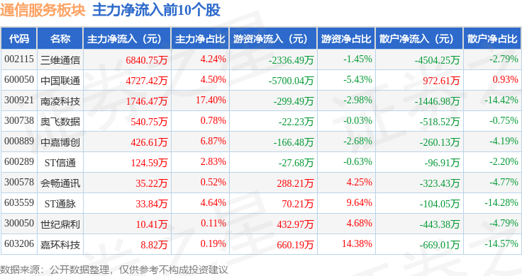 从资金流向上来看,当日通信服务板块主力资金净流出5.17亿元,游资资金净流入7507.57万元,散户资金净流入4.42亿元。通信服务板块个股资金流向见下表: