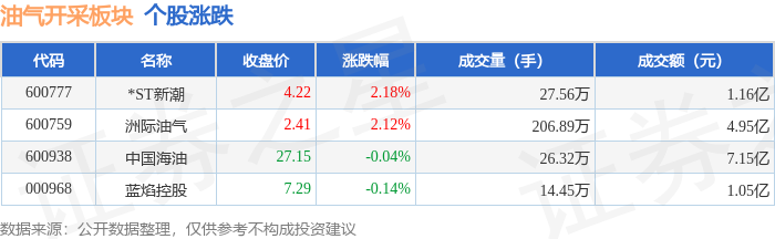 证券之星消息,10月29日油气开采板块较上一交易日上涨0.6%,*ST新潮领涨。当日上证指数报收于4016.33,上涨0.7%。深证成指报收于13691.38,上涨1.95%。油气开采板块个股涨跌见下表: