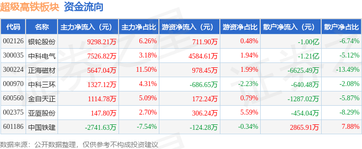 从资金流向上来看,当日超级高铁板块主力资金净流入2.23亿元,游资资金净流入5942.5万元,散户资金净流出2.83亿元。超级高铁板块个股资金流向见下表:
