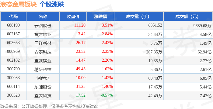 证券之星消息,10月29日液态金属板块较上一交易日上涨1.92%,云路股份领涨。当日上证指数报收于4016.33,上涨0.7%。深证成指报收于13691.38,上涨1.95%。液态金属板块个股涨跌见下表: