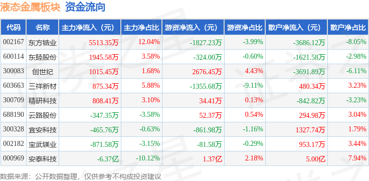 从资金流向上来看,当日液态金属板块主力资金净流出5.52亿元,游资资金净流入1.21亿元,散户资金净流入4.32亿元。液态金属板块个股资金流向见下表: