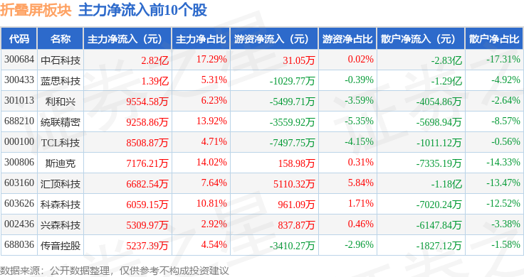 从资金流向上来看,当日折叠屏板块主力资金净流出10.73亿元,游资资金净流入5.98亿元,散户资金净流入4.74亿元。折叠屏板块个股资金流向见下表: