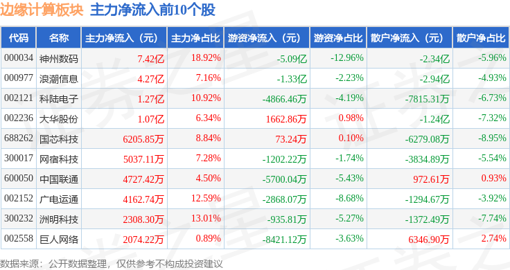 从资金流向上来看,当日边缘计算板块主力资金净流出24.72亿元,游资资金净流入5.93亿元,散户资金净流入18.79亿元。边缘计算板块个股资金流向见下表: