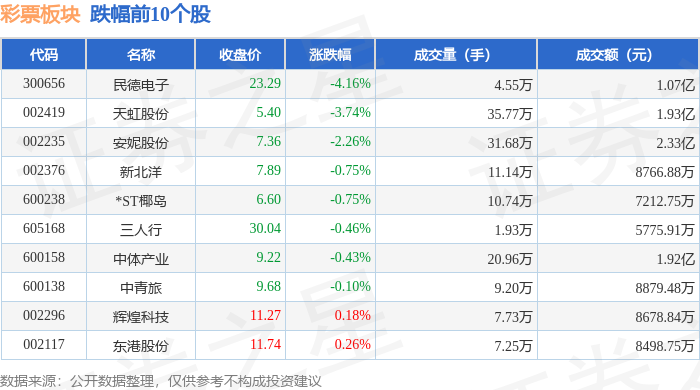 证券之星消息,10月29日彩票板块较上一交易日下跌0.09%,民德电子领跌。当日上证指数报收于4016.33,上涨0.7%。深证成指报收于13691.38,上涨1.95%。彩票板块个股涨跌见下表: