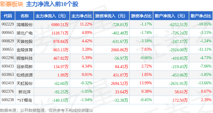从资金流向上来看,当日彩票板块主力资金净流入3381.5万元,游资资金净流入4535.92万元,散户资金净流出7917.42万元。彩票板块个股资金流向见下表: