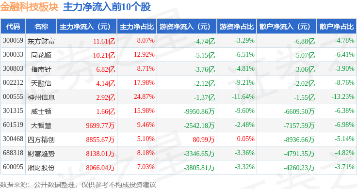 从资金流向上来看,当日金融科技板块主力资金净流入21.07亿元,游资资金净流出17.07亿元,散户资金净流出4.0亿元。金融科技板块个股资金流向见下表:
