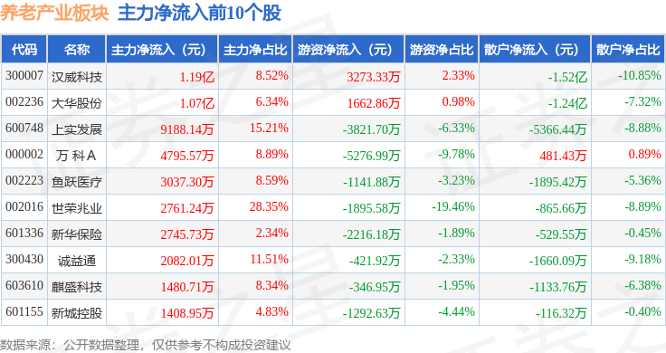 从资金流向上来看,当日养老产业板块主力资金净流出2.7亿元,游资资金净流入1104.36万元,散户资金净流入2.59亿元。养老产业板块个股资金流向见下表: