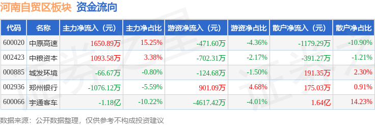 从资金流向上来看,当日河南自贸区板块主力资金净流出1.02亿元,游资资金净流出5014.91万元,散户资金净流入1.52亿元。河南自贸区板块个股资金流向见下表: