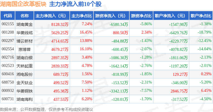 从资金流向上来看,当日湖南国企改革板块主力资金净流入252.29万元,游资资金净流出1.66亿元,散户资金净流入1.63亿元。湖南国企改革板块个股资金流向见下表: