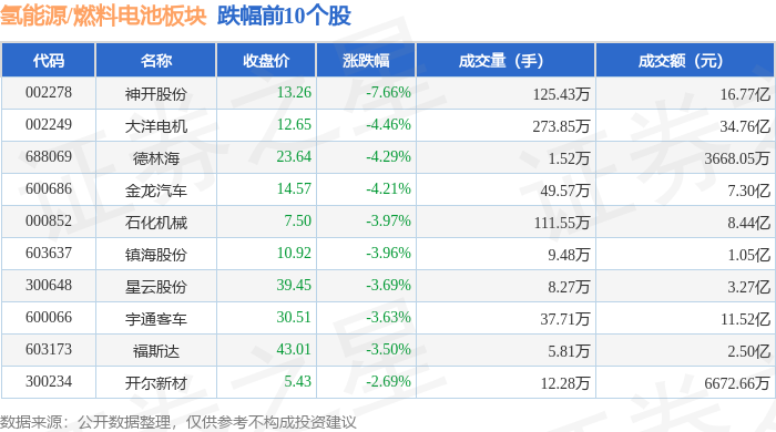 从资金流向上来看,当日氢能源/燃料电池板块主力资金净流入33.98亿元,游资资金净流出31.31亿元,散户资金净流出2.67亿元。氢能源/燃料电池板块个股资金流向见下表: